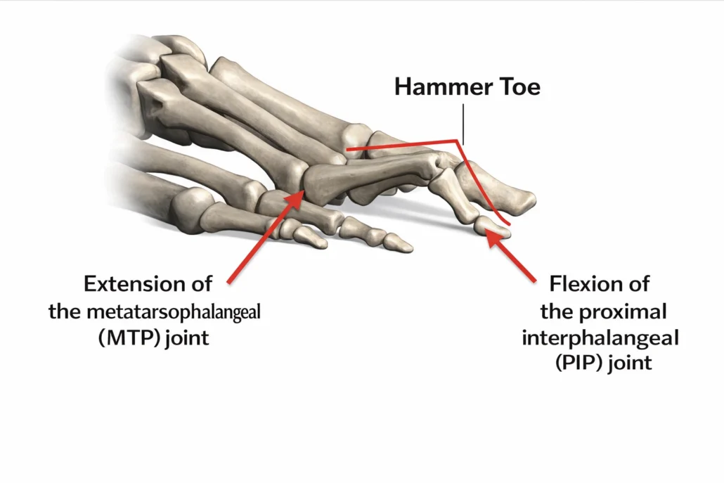 Hammer toe is defined as a flexion deformity at the proximal interphalangeal joint, often accompanied by extension at the metatarsophalangeal (MTP) joint. In early stages, the deformity may be flexible, meaning the toe can still be manually straightened. In later stages, the soft tissues adapt, the joint capsule tightens, and the deformity becomes rigid.