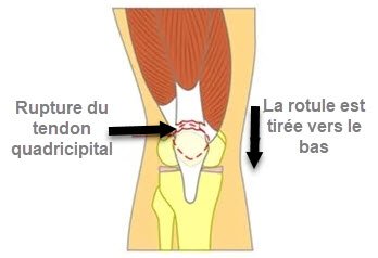 The image shows the rupture of the quadriceps tendon, which connects the quadriceps muscle to the patella (kneecap).