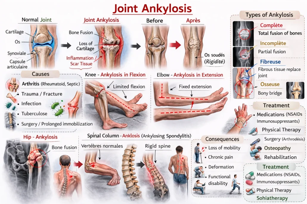- Réponse à des traumatismes graves : En cas de traumatismes articulaires graves, tels que des fractures complexes ou des lésions ligamentaires sévères, l’ankylose peut se produire comme une forme de stabilisation pour éviter des mouvements potentiellement nocifs.