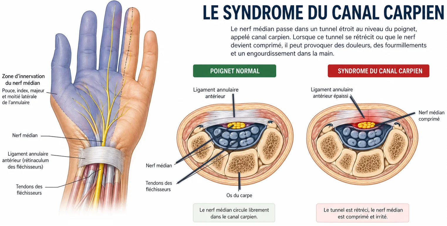 Le syndrome du canal carpien est une compression fréquente du nerf médian au poignet. Lorsqu’il est reconnu tôt, une prise en charge adaptée permet souvent de réduire les symptômes et d’éviter l’aggravation.