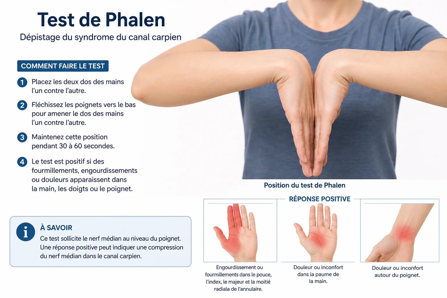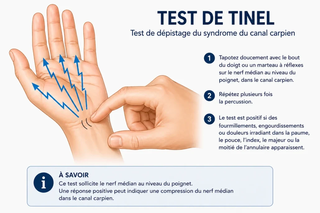 - Le diagnostic repose sur l’histoire clinique, l’examen physique et parfois des tests comme Tinel, Phalen, l’EMG ou les études de conduction nerveuse.
