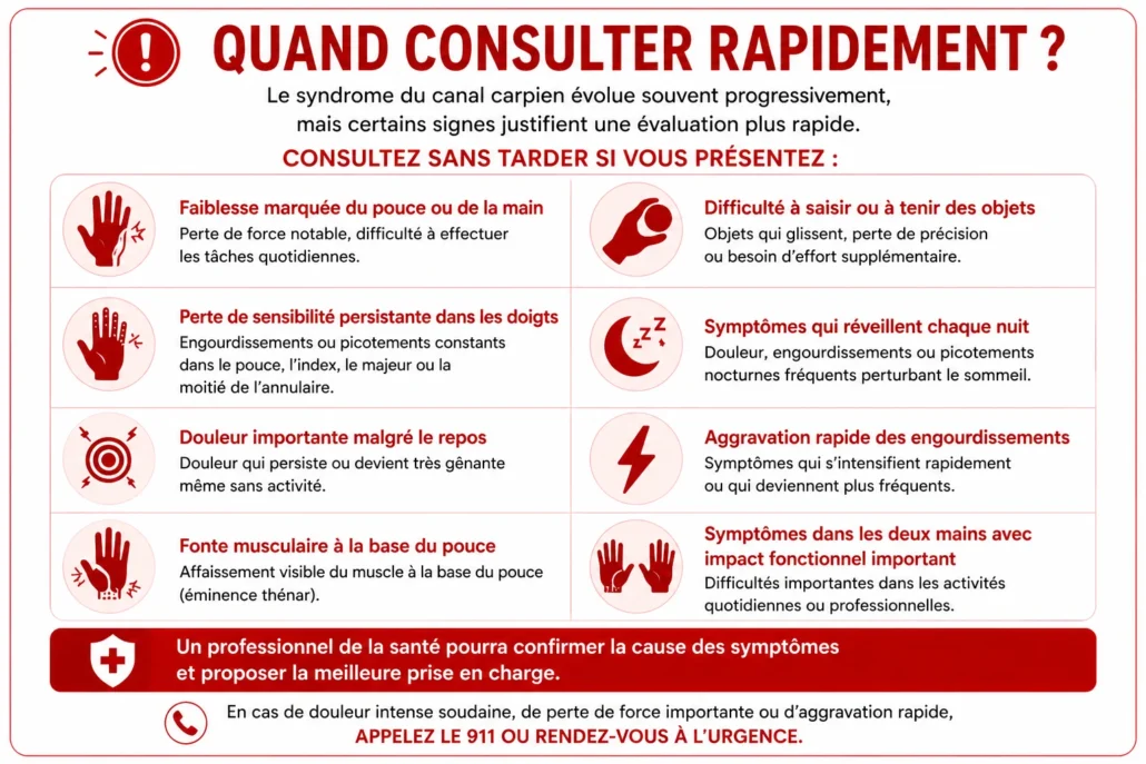 - Une consultation rapide est recommandée si les symptômes persistent, s’aggravent ou s’accompagnent d’une perte de force de la main.