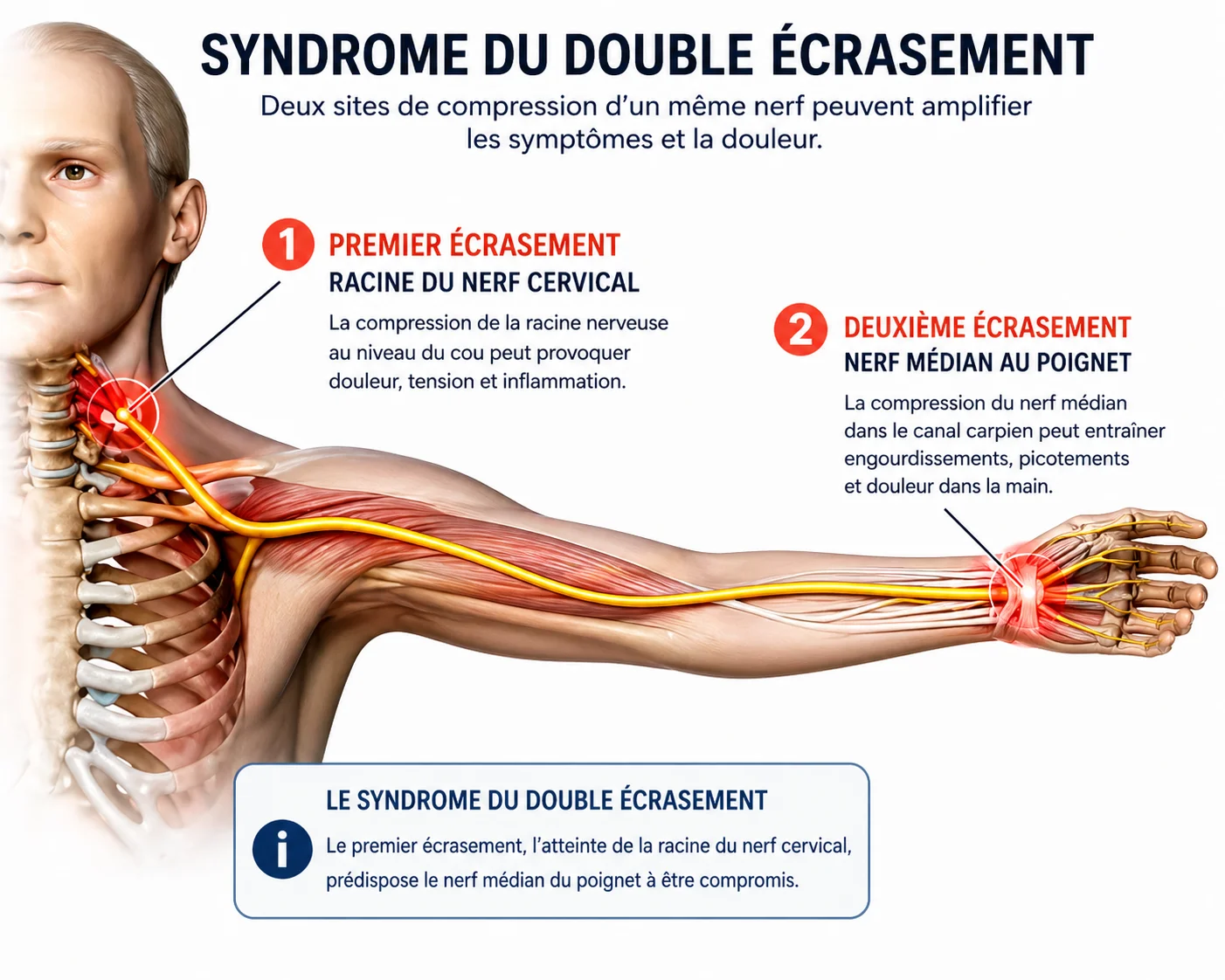 - Le syndrome du canal carpien peut parfois être confondu avec une radiculopathie cervicale ou s’inscrire dans un syndrome du double écrasement.