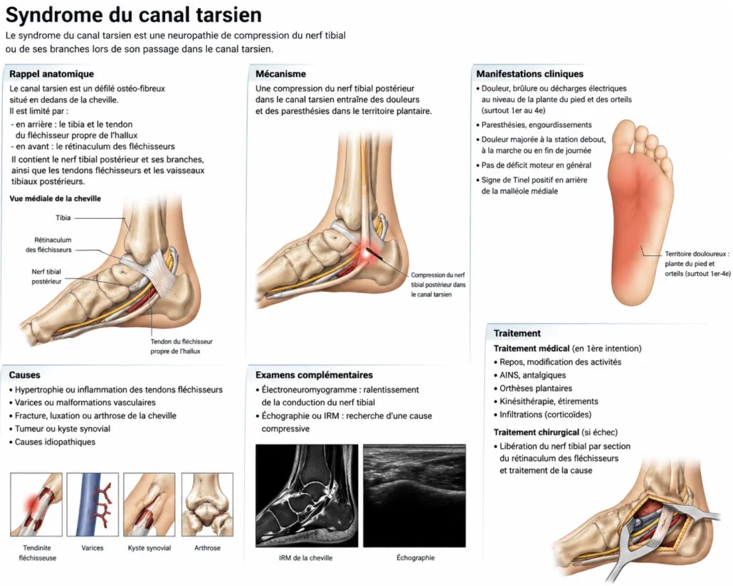 | Tunnel tarsien postérieur | Brûlure sous le pied ou dedans cheville | Symptômes plantaires plutôt que dorsaux |