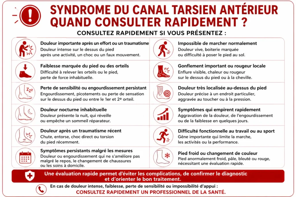 La majorité des compressions nerveuses du dessus du pied peuvent être traitées de façon conservatrice. Toutefois, certains signes justifient une évaluation plus rapide afin d’éviter une aggravation ou de confirmer un autre diagnostic.