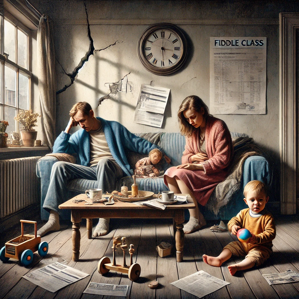 DALL·E 2025-01-08 15.47.35 – A realistic and evocative illustration representing the fragile middle class. The scene shows a family in a modest living room with visible signs of f