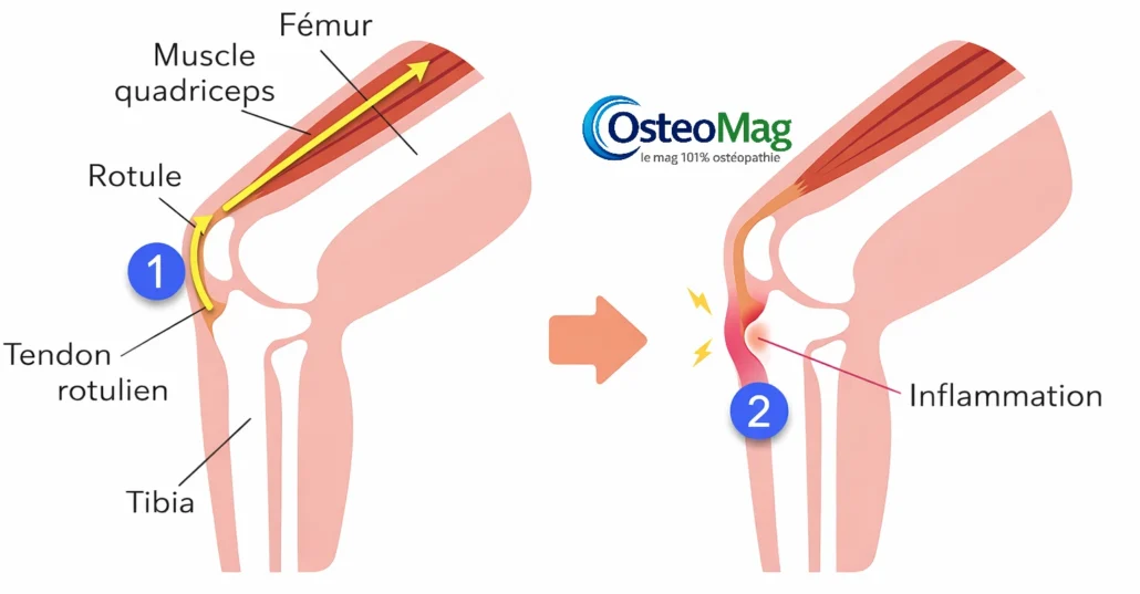 Lorsque sa tonicité excède la capacité d’adaptation des structures osseuses en croissance, il exerce une traction excessive sur le tendon rotulien, ce qui accentue la contrainte sur la tubérosité tibiale antérieure.