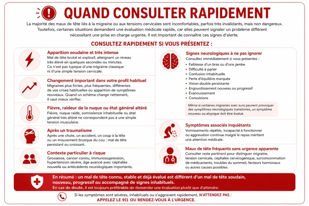 - Un nouveau mal de tête intense, brutal ou accompagné de signes neurologiques nécessite une évaluation rapide.