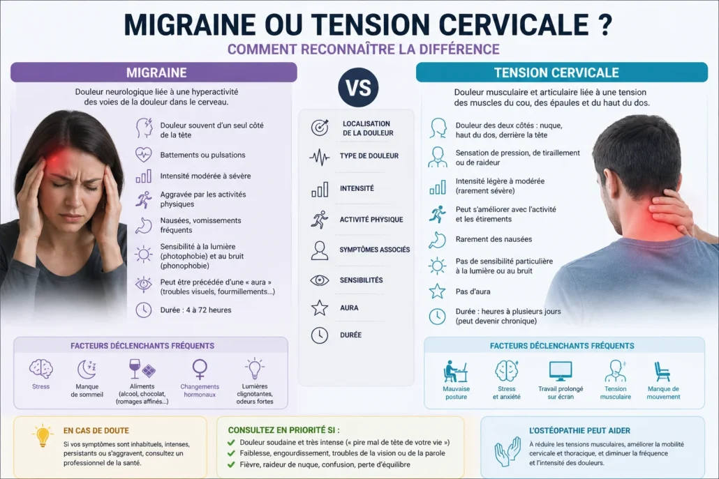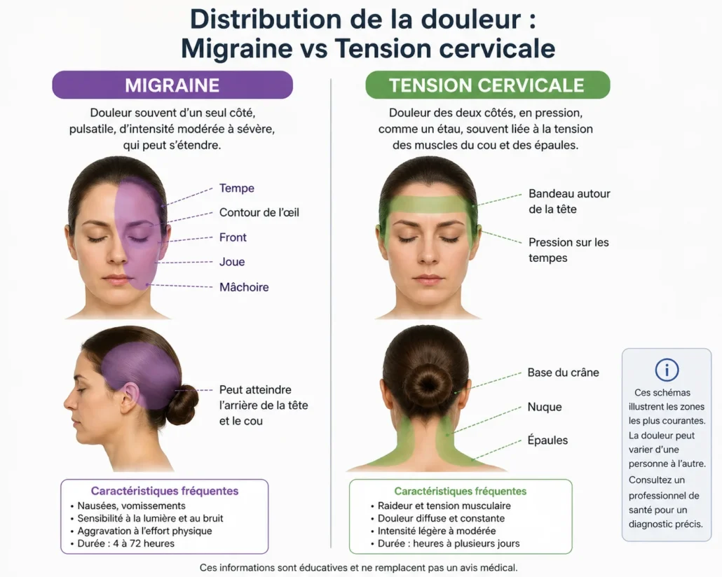 La migraine est souvent plus neurologique et sensorielle, tandis que la tension cervicale est fréquemment liée au cou, à la posture et aux muscles. Bien identifier la source dominante aide à choisir les bonnes stratégies de traitement et de prévention. :contentReference[oaicite:1]{index=1}