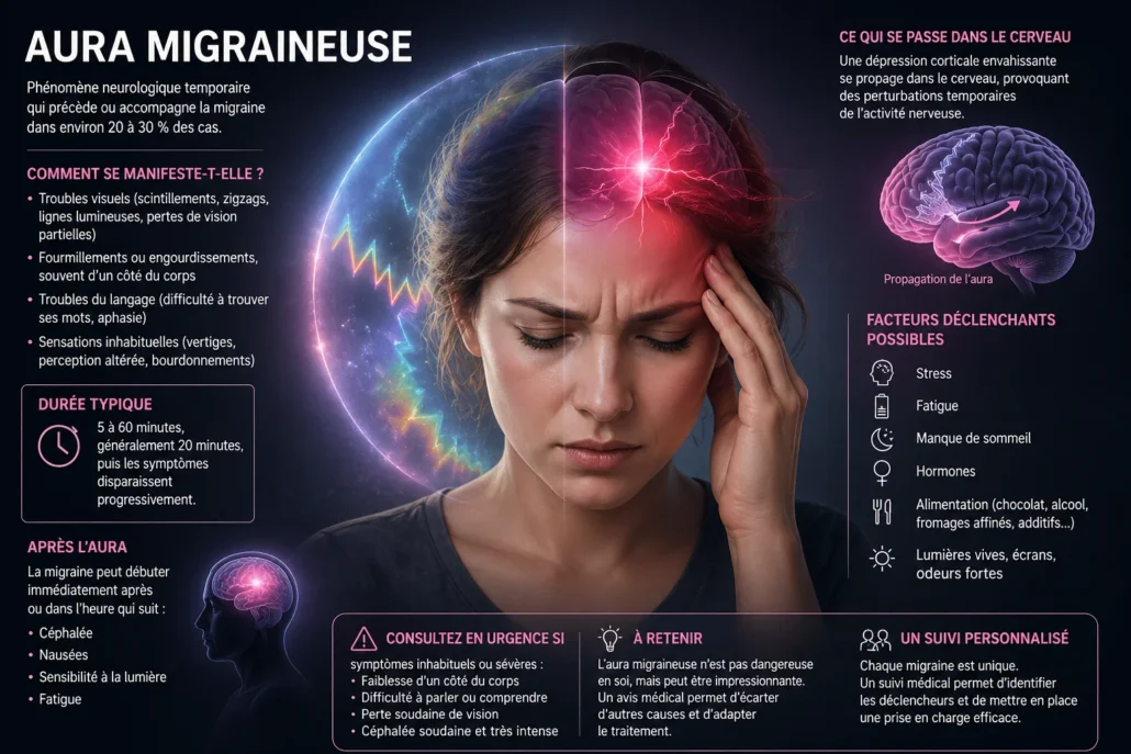 Certaines personnes présentent une aura migraineuse, c’est-à-dire des symptômes neurologiques transitoires précédant ou accompagnant la crise. Cela peut inclure des scintillements visuels, des zones floues, des fourmillements, des troubles du langage ou une sensation étrange difficile à décrire. L’aura ne survient pas chez tout le monde.