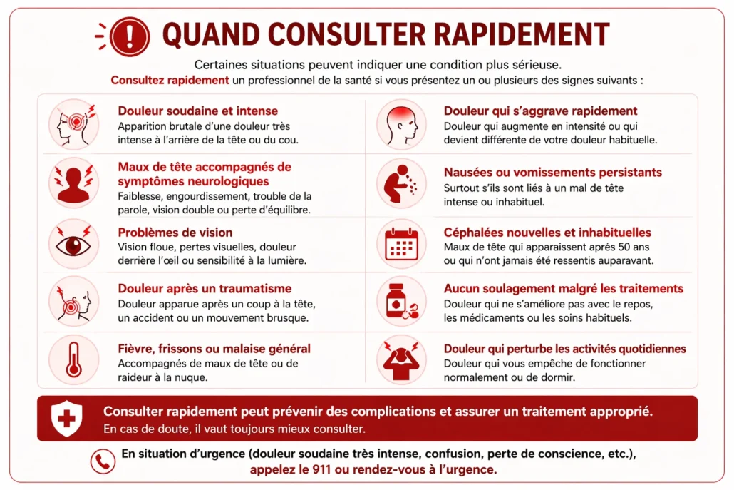 Il est recommandé de consulter un professionnel de santé si la douleur occipitale est accompagnée de :