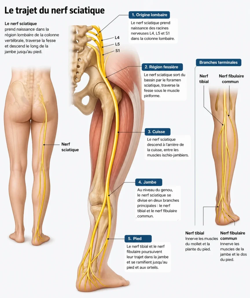 Contrairement à une idée répandue, la sciatique n’est pas une maladie en soi. Il s’agit plutôt d’un symptôme neurologique qui survient lorsqu’un nerf situé dans la région lombaire est irrité ou comprimé. Dans la majorité des cas, cette irritation concerne le nerf sciatique, le plus long nerf du corps humain. Celui-ci prend naissance dans la partie inférieure de la colonne vertébrale, traverse le bassin, puis descend dans la fesse et la jambe jusqu’au pied.