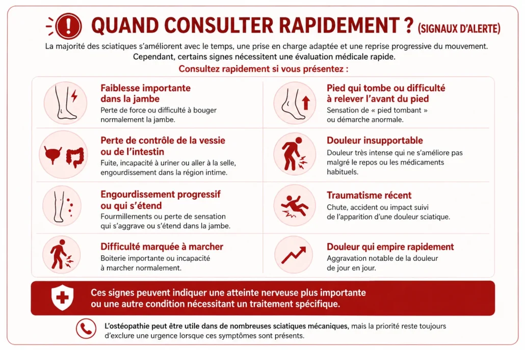 L’ostéopathie peut être utile dans de nombreuses sciatiques mécaniques, mais la priorité reste toujours d’exclure une urgence lorsque ces symptômes sont présents.