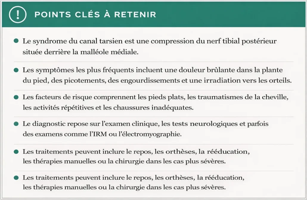 Il est essentiel de consulter un professionnel de la santé pour un diagnostic précis et un plan de traitement approprié en cas de suspicion de syndrome du tunnel tarsien.