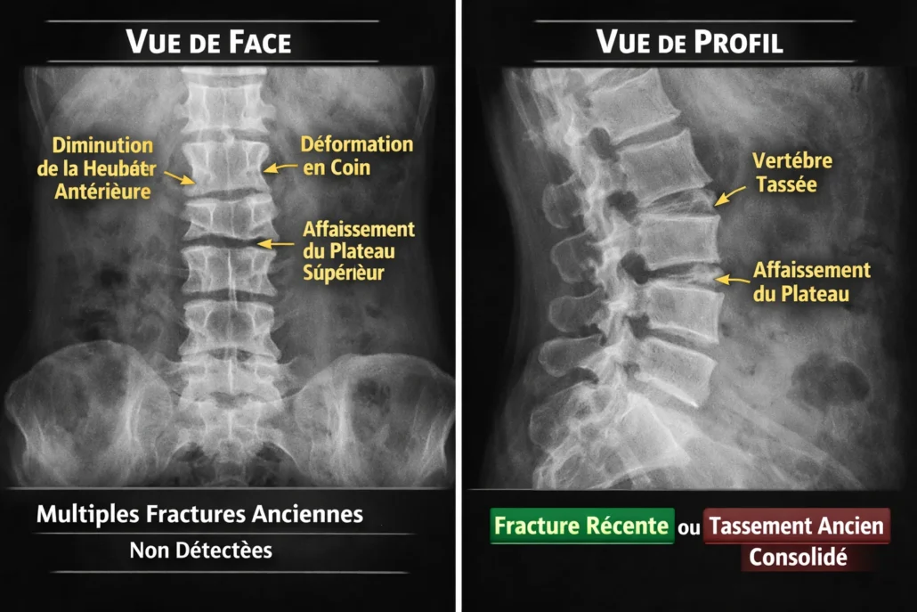 La radiographie permet aussi de détecter des fractures anciennes passées inaperçues. Chez certaines personnes, plusieurs tassements successifs peuvent être visibles, expliquant une perte progressive de taille ou une accentuation de la cyphose thoracique.