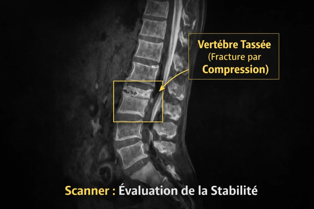 D’abord, en cas de doute sur la stabilité de la fracture. Le scanner permet une analyse fine des parois vertébrales, notamment de la paroi postérieure du corps vertébral. Une atteinte de cette paroi, un recul d’un fragment osseux vers le canal rachidien ou une fissuration complexe peuvent modifier la stratégie thérapeutique. La TDM aide alors à distinguer une simple fracture par compression stable d’une fracture plus complexe nécessitant une surveillance rapprochée ou une prise en charge spécialisée.