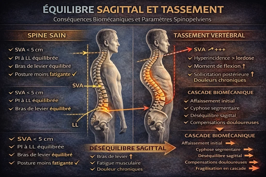 Lorsqu’un tassement survient à ce niveau, l’augmentation locale de la cyphose crée un moment de flexion antérieur. Le centre de gravité se déplace en avant, augmentant le bras de levier compressif.